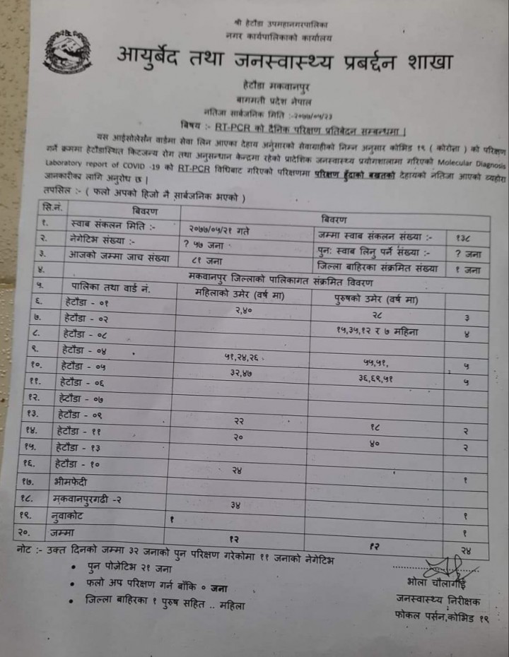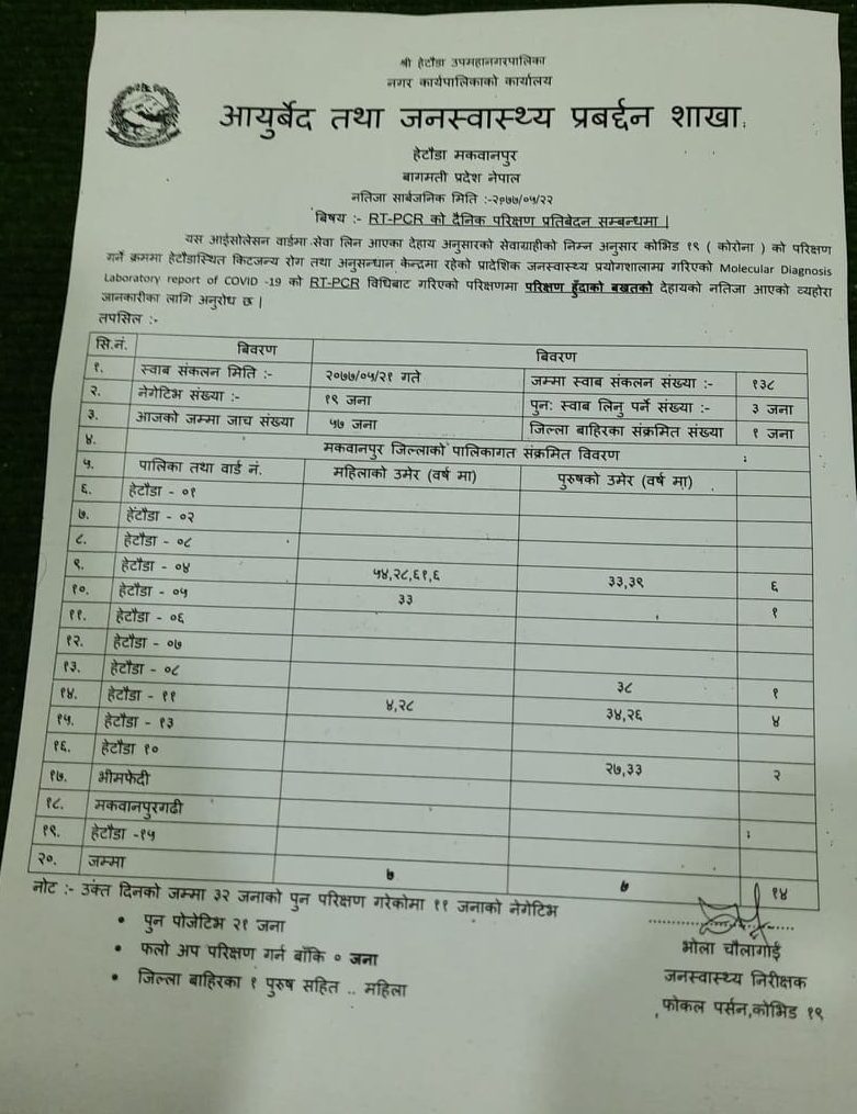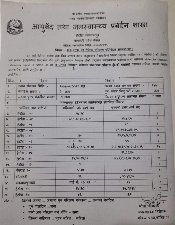 हेटौंडामा थप १४ जनामा कोरोना संक्रमण पुष्टि