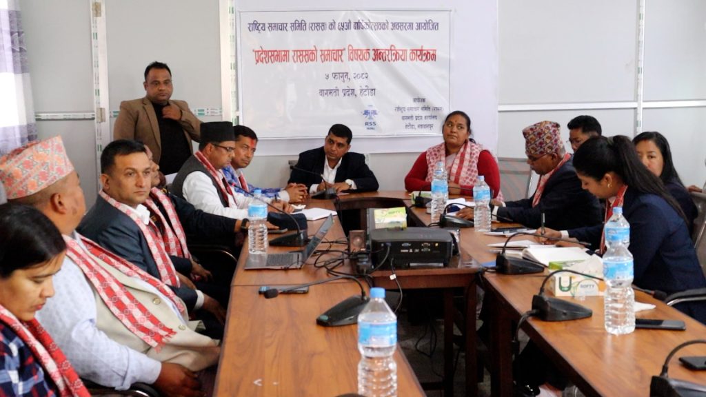 रासस बागमती प्रदेश कार्यालयका प्रमुख राजु विश्वकर्माको अध्यक्षतामा आयोजित अन्तरक्रिया कार्यक्रममा जिल्ला समन्वय समिति मकवानपुरका प्रमुख ललित घलान, वन विज्ञान अध्ययन संस्थानका प्राध्यापक योगेन्द्र यादव, प्रदेशसभाका सचिव रामप्रसाद पौडेल, पत्रकार महासंघ बागमती प्रदेशका अध्यक्ष कृष्णसारु मगर, जिल्ला अध्यक्ष बालकृष्ण अधिकारी, गैसस बागमती प्रदेश अध्यक्ष कमल विश्वकर्मा लगायतले सञ्चार क्षेत्रमा राससले पु¥याएको योगदान बारे चर्चा गर्नुभएको थियो ।